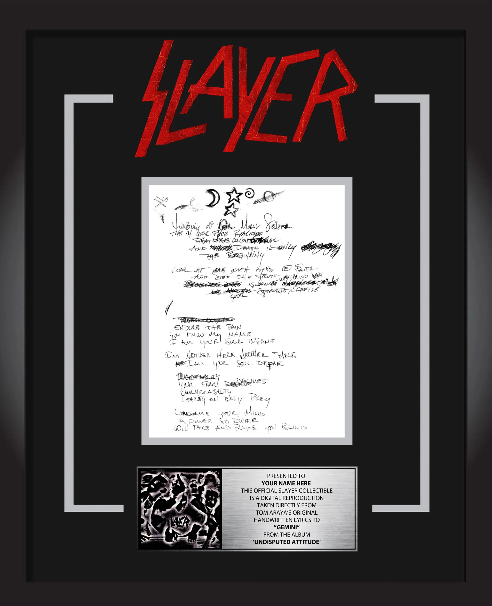 PRESENTED TO [YOUR NAME HERE ]THIS OFFICIAL SLAYER COLLECTIBLE IS A DIGITAL REPRODUCTION TAKEN DIRECTLY FROM TOM ARAYA'S ORIGINAL HANDWRITTEN LYRICS TO ”GEMINI” FROM THE ALBUM UNDISPUTED ATTITUDE.