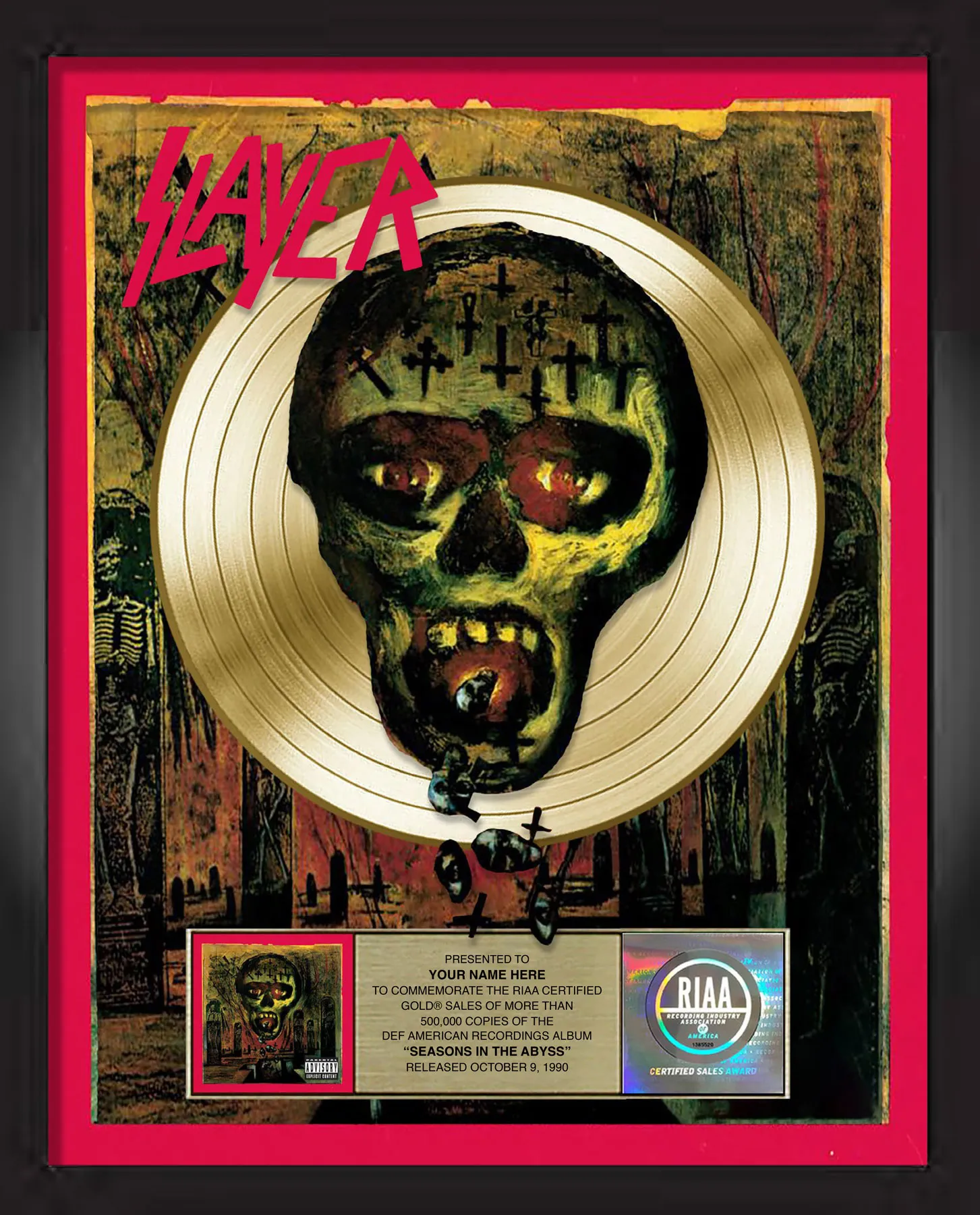 This official RIAA-certified Gold sales plaque commemorates Seasons in the Abyss, released October 9, 1990.