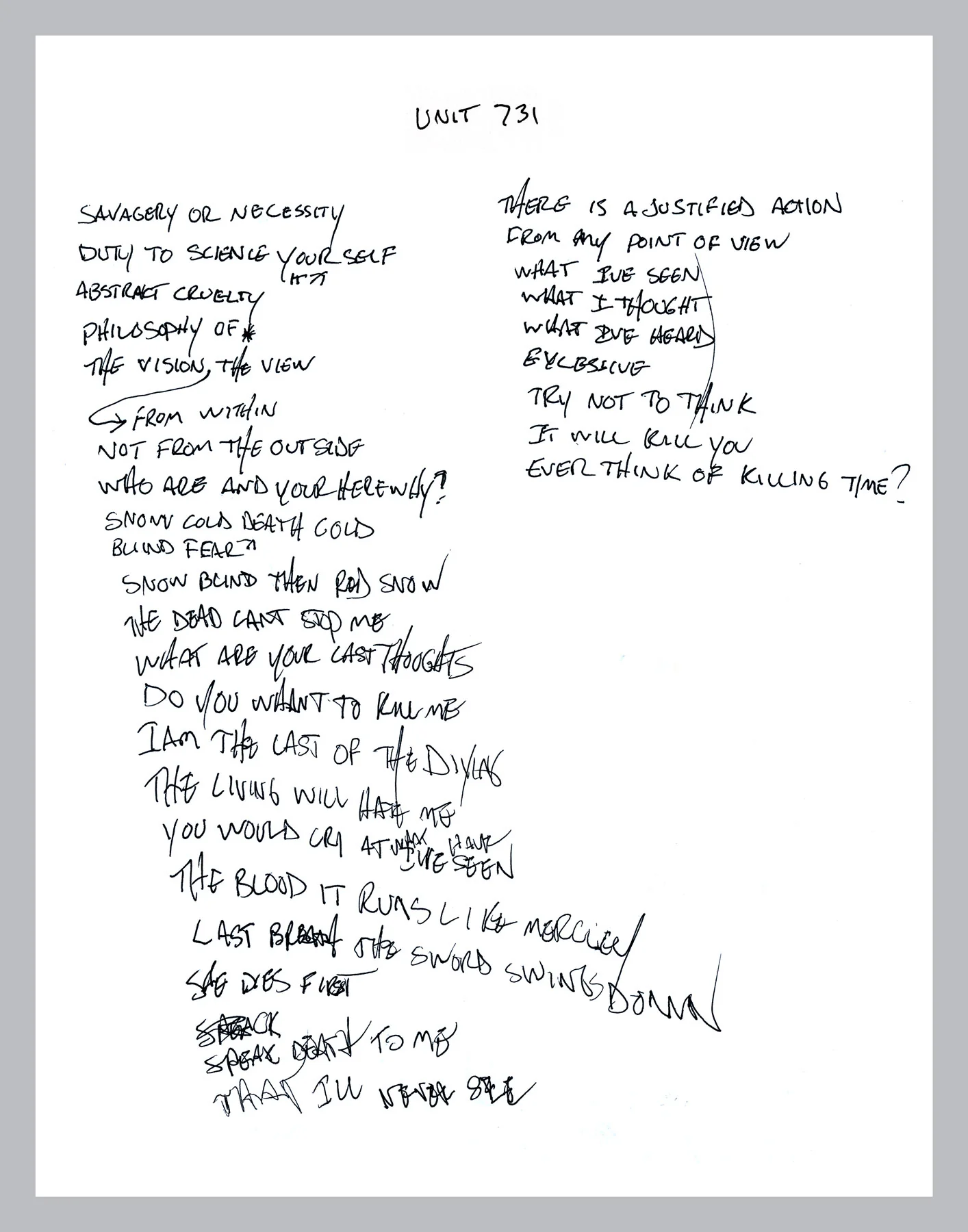 PRESENTED TO [YOUR NAME HERE ]THIS OFFICIAL SLAYER COLLECTIBLE IS A DIGITAL REPRODUCTION TAKEN DIRECTLY FROM JEFF HANNEMAN'S ORIGINAL HANDWRITTEN LYRICS TO ”UNIT 731” FROM THE ALBUM WORLD PAINTED BLOOD.